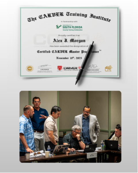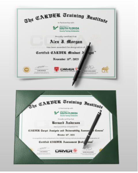 The Certified CARVER Assessment Professional®(CCAP) is the foundational professional certification for applying CARVER in a structured, measurable way. This credential demonstrates the ability to evaluate criticality, accessibility, recoverability, vulnerability, effect, and recognizability across real-world environments.