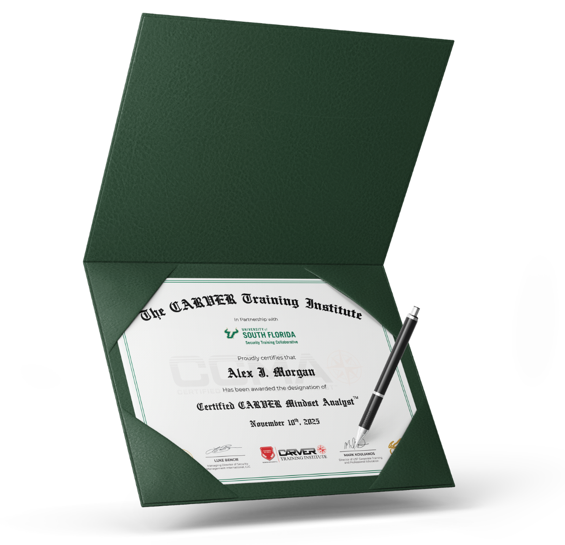 The Certified CARVER Mindset Analyst™ (CCMA) is designed for professionals who want to develop the ability to think with greater awareness, precision, and strategic foresight. This certification focuses on the mindset behind CARVER—how to evaluate situations, recognize patterns, identify vulnerabilities, and make smarter judgments before others even realize a problem exists.
